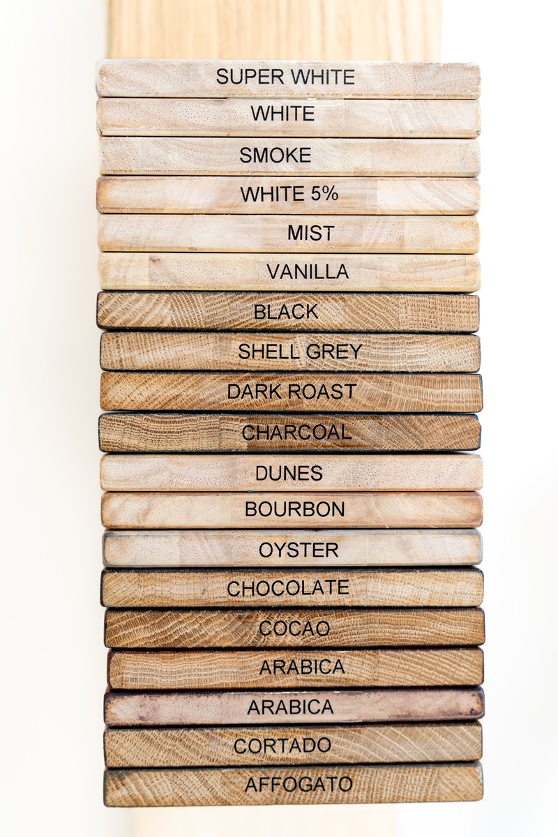 Binnen de donkere en warmere eiken kleuren zijn er veel mooie opties, zoals Black, Shell Grey, Dark Roast, Charcoal, Bourbon, Chocolate, Cocao, Arabica, Arabica en Cortado. Ook Affogato valt in deze rijkere, warmere kleurfamilie. Sommige tinten zijn koeler en strakker, terwijl andere juist meer warmte en diepte geven. Black en Charcoal zorgen voor een krachtig modern effect. Dark Roast, Chocolate, Cocao, Cortado en Affogato geven juist een warme, luxe uitstraling met veel sfeer.